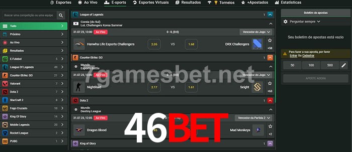 O 46Bet oferece uma grande seleção de opções de apostas em e-sports com probabilidades competitivas